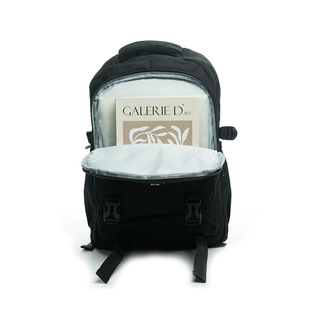 • جيب مزدوج مع جيبين أماميين، أحدهما مزود بمنظم للأقلام ومساحتين بأحجام مختلفة.
