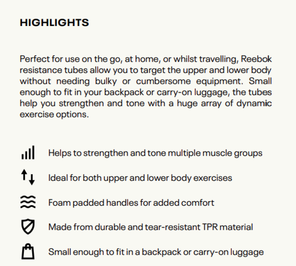 تعتبر أنابيب المقاومة من Reebok مثالية للاستخدام أثناء التنقل أو في المنزل أو أثناء السفر، حيث تتيح لك استهداف الجزء العلوي والسفلي من الجسم دون الحاجة إلى معدات ضخمة أو مرهقة. وبفضل حجمها الصغير الذي يناسب حقيبة الظهر أو حقيبة اليد، تساعدك الأنابيب على تقوية وتقوية العضلات من خلال مجموعة ضخمة من خيارات التمارين الديناميكية.