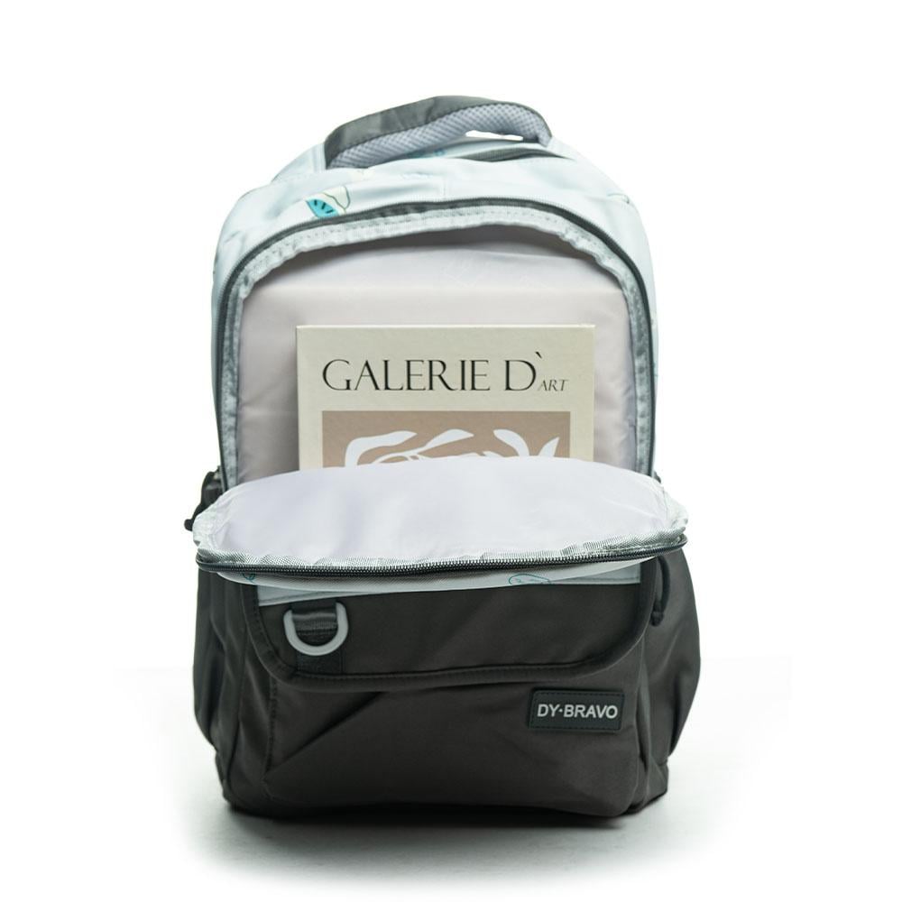• جيب مزدوج مع جيبين أماميين، أحدهما مزود بمنظم للأقلام ومساحتين بأحجام مختلفة.